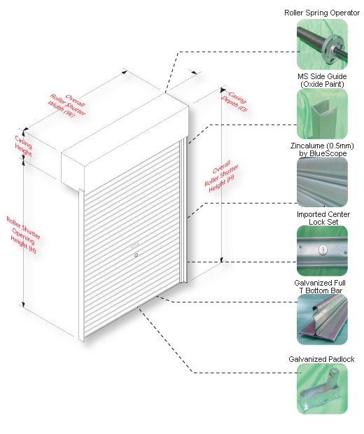 The roller shutter comes with two standard locking devices. First, center lock secured by rivet and steel bar. Second, ground mounted galvanized padlock kit allows user to install their additional padlock.